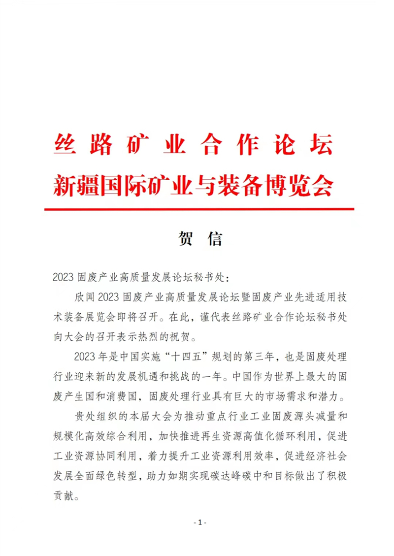 感謝絲路礦業(yè)合作論壇秘書處對(duì)我公司聯(lián)合主辦的的固廢產(chǎn)業(yè)交流大會(huì)發(fā)來(lái)賀信