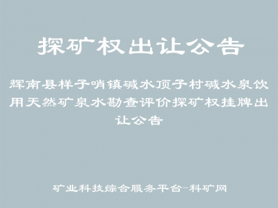 受出讓人通化市自然資源局委托,按照自然資源部《礦業(yè)權(quán)出讓交易規(guī)則》(自然資規(guī)〔2023〕1號(hào))等有關(guān)規(guī)定及要求,通化市公共資源交易中心(通化市政府采購(gòu)中心)對(duì)《輝南縣樣子哨鎮(zhèn)堿水頂子村堿水泉飲用天然礦泉水勘查評(píng)價(jià)》探礦權(quán)以掛牌方式進(jìn)行出讓?,F(xiàn)將有關(guān)事宜公告如下: