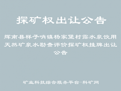 受出讓人通化市自然資源局委托,按照自然資源部《礦業(yè)權(quán)出讓交易規(guī)則》(自然資規(guī)〔2023〕1號)等有關(guān)規(guī)定及要求,通化市公共資源交易中心(通化市政府采購中心)對《輝南縣樣子哨鎮(zhèn)楊家堡村露水泉飲用天然礦泉水勘查評價》探礦權(quán)以掛牌方式進行出讓?,F(xiàn)將有關(guān)事宜公告如下: