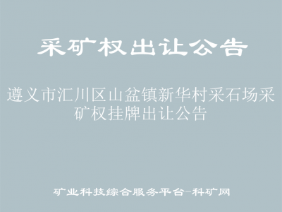 根據(jù)《中華人民共和國民法典》、《中華人民共和國礦產(chǎn)資源法》、《中華人民共和國電子簽名法》、《礦業(yè)權(quán)出讓交易規(guī)則》(自然資規(guī)〔2023〕1號等有關(guān)規(guī)定,匯川區(qū)自然資源局?jǐn)M對貴州省遵義市匯川區(qū)山盆鎮(zhèn)新華村采石場采礦權(quán)進(jìn)行網(wǎng)上掛牌出讓?,F(xiàn)將有關(guān)事項公告如下: