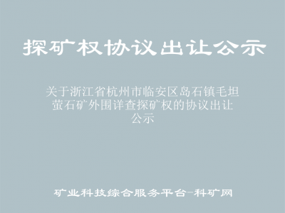 根據《自然資源部關于深化礦產資源管理改革若干事項的意見》(自然資規(guī)〔2023〕6號)和《自然資源部關于印發(fā)礦業(yè)權出讓交易規(guī)則的通知》(自然資規(guī)〔2023〕1號)有關規(guī)定,現將擬協議出讓浙江省杭州市臨安區(qū)島石鎮(zhèn)毛坦螢石礦外圍詳查探礦權有關事項公示如下。