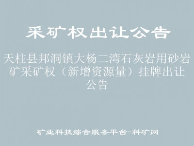 根據(jù)《礦產(chǎn)資源開采登記管理辦法》(國務(wù)院241號令)、《中華人民共和國礦產(chǎn)資源法》、國土資源部《探礦權(quán)采礦權(quán)招標(biāo)拍賣掛牌管理辦法(試行)》、《省人民政府辦公廳關(guān)于全面推行礦業(yè)權(quán)招拍掛出讓制度的通知(黔府辦發(fā)〔2014〕33號)》、《貴州省自然資源廳關(guān)于深入推進(jìn)礦產(chǎn)資源管理改革若干事項(xiàng)的意見(試行)》(黔自然資規(guī)〔2020〕4號)的有關(guān)規(guī)定,經(jīng)天柱縣人民政府批準(zhǔn),天柱縣自然資源局委托黔東南州公共資源交易中心網(wǎng)上公開掛牌出讓天柱縣邦洞鎮(zhèn)大楊二灣石灰?guī)r用砂巖礦(新增資源量)。