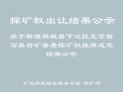 受出讓方阿克蘇地區(qū)自然資源局委托,新疆拜城縣下達(dá)拉克可格石英巖礦普查探礦權(quán)公開掛牌出讓項(xiàng)目于2023年12月21日至2024年1月5日在阿克蘇地區(qū)公共資源交易電子招投標(biāo)平臺(tái)掛牌出讓。根據(jù)《中華人民共和國(guó)礦產(chǎn)資源法》《礦業(yè)權(quán)出讓交易規(guī)則》等有關(guān)法律法規(guī)的規(guī)定,現(xiàn)將成交結(jié)果公示如下: