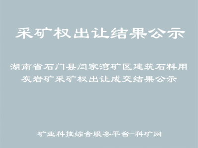 2023年12月14日-2023年12月28日,常德市公共資源交易中心受常德市自然資源和規(guī)劃局的委托,通過互聯(lián)網(wǎng),使用常德市公共資源交易中心礦業(yè)權(quán)交易系統(tǒng),公開掛牌出讓了湖南省石門縣閆家灣礦區(qū)建筑石料用灰?guī)r礦采礦權(quán),現(xiàn)將成交結(jié)果公示如下: