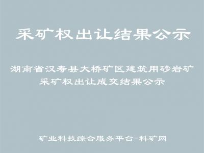 2023年12月14日-2023年12月28日,常德市公共資源交易中心受常德市自然資源和規(guī)劃局的委托,通過(guò)互聯(lián)網(wǎng),使用常德市公共資源交易中心礦業(yè)權(quán)交易系統(tǒng),公開(kāi)掛牌出讓了湖南省漢壽縣大橋礦區(qū)建筑用砂巖礦采礦權(quán),現(xiàn)將成交結(jié)果公示如下: