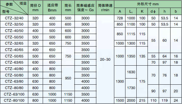 CTZ 系列中場(chǎng)強(qiáng)永磁滾筒(分半磁和全磁兩種)多用于對(duì)粉狀、顆粒狀、小塊狀物料的凈化處理,或?qū)﹁F質(zhì)的回收利用,它安裝方便、吸力強(qiáng)、無(wú)能耗、連續(xù)工作、操作簡(jiǎn)單。廣泛應(yīng)用于冶金、陶瓷、磨料磨具、金剛砂、非金屬礦、耐火材料、礦山、食品、化工、玻璃、建材等行業(yè)。主要技術(shù)參數(shù):