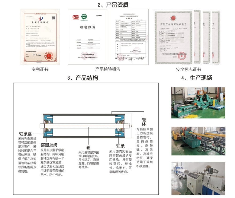 業(yè)現(xiàn)代化“減員提效”相背離。針對(duì)影響托輥使用壽命的四大問題,我們借鑒國內(nèi)外先進(jìn)技術(shù)經(jīng)驗(yàn),成功研發(fā)了新型耐損耐酸堿聚合物托輥,其管體為我公司引進(jìn)德國技術(shù)工藝和設(shè)備,以多種高分子材料混合物通過一系列工藝流程加工而成的托輥專用聚合物管材,擁有自主知識(shí)產(chǎn)權(quán)。新型聚合物托輥除軸和軸承為鋼制外,其余組件全部由熱塑性工程料制成,耐磨損、耐酸堿、抗沖擊力強(qiáng)、重量輕、壽命長、不黏連物料、不結(jié)冰,是替代傳統(tǒng)托輥的優(yōu)秀產(chǎn)品。新型聚合物托輥解決了以下四項(xiàng)核心技術(shù):