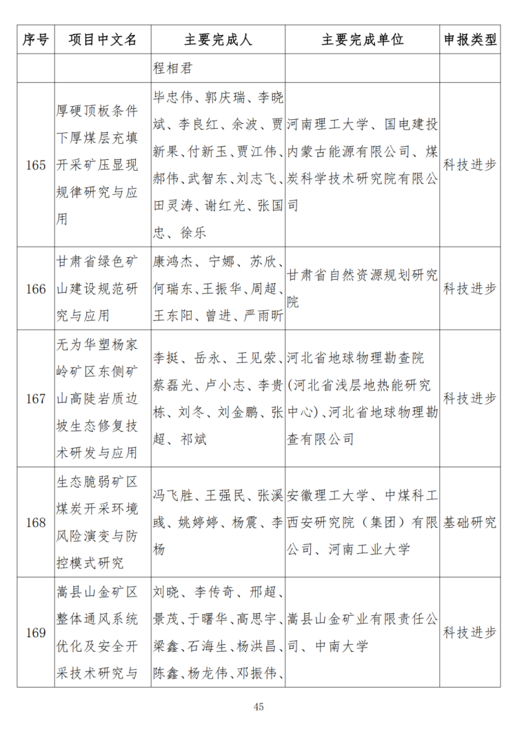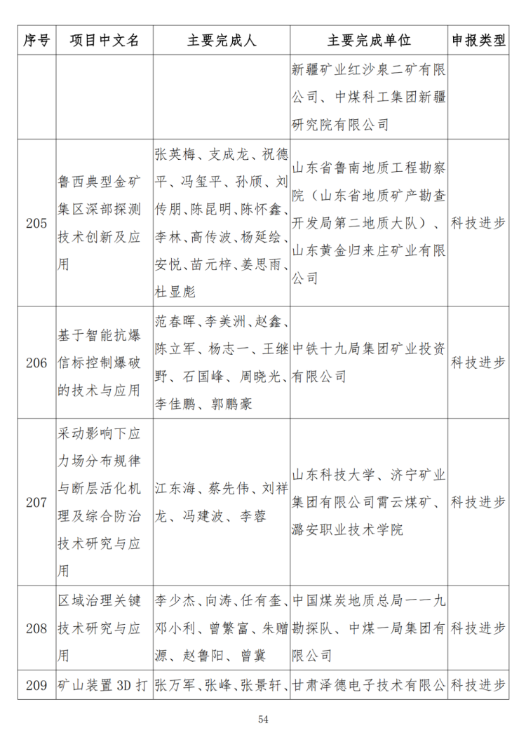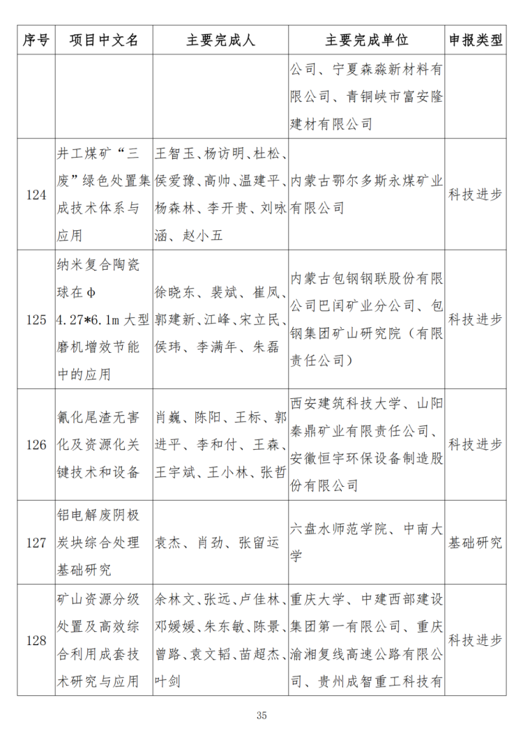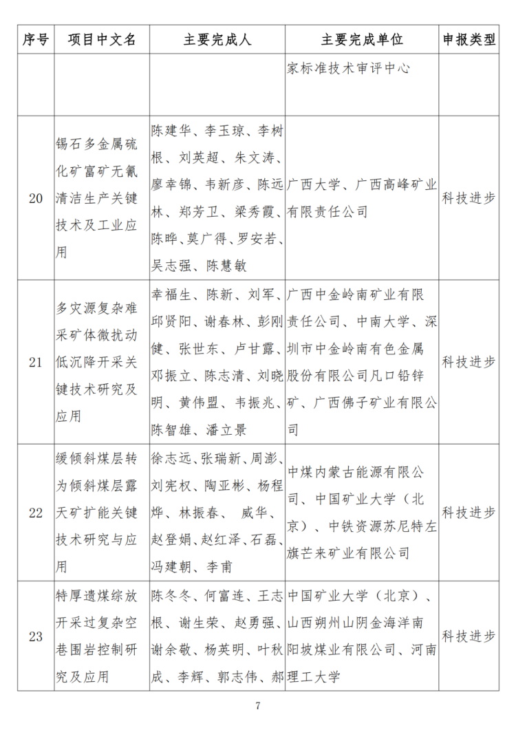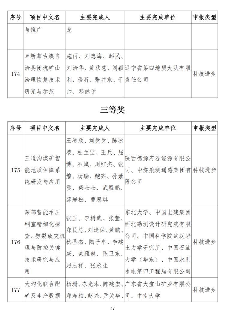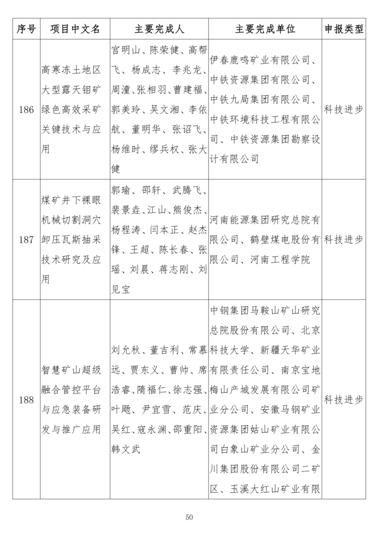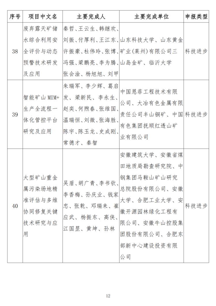 全體會員及各相關(guān)人員:依據(jù)《綠色礦山科學(xué)技術(shù)獎管理辦法》規(guī)定和《關(guān)于申報2024年度綠色礦山科學(xué)技術(shù)獎的通知》的要求,綠色礦山科學(xué)技術(shù)獎勵辦公室對申報綠色礦山科學(xué)技術(shù)獎(國家獎勵辦備案編號0265)的基礎(chǔ)研究、科技進步、發(fā)明(專利)三類獎項通過申報、形式審查、初評、終評、復(fù)核等環(huán)節(jié),確定了235項成果為2024年度綠色礦山科學(xué)技術(shù)獎的擬獲獎項目,現(xiàn)進行公示。一等獎完成人不超過15人、二等獎完成人不超過10人、三等獎完成人不超過5人。對于完成人超過限額的項目,請與綠色礦山科學(xué)技術(shù)獎勵辦公室聯(lián)系。自公示之日起7日內(nèi),任何單位以及個人對擬獲獎名單有異議者,須以本人真實身份以書面形式向綠色礦山科學(xué)技術(shù)獎勵辦公室提出,同時需要提供準(zhǔn)確的相關(guān)材料。凡是匿名異議以及超過公示期內(nèi)提出異議者恕不予受理。特此公示。聯(lián)系方式: 聯(lián)系人:呂老師 15712878741通訊地址:北京市海淀區(qū)學(xué)清路9號匯智大廈B座311室