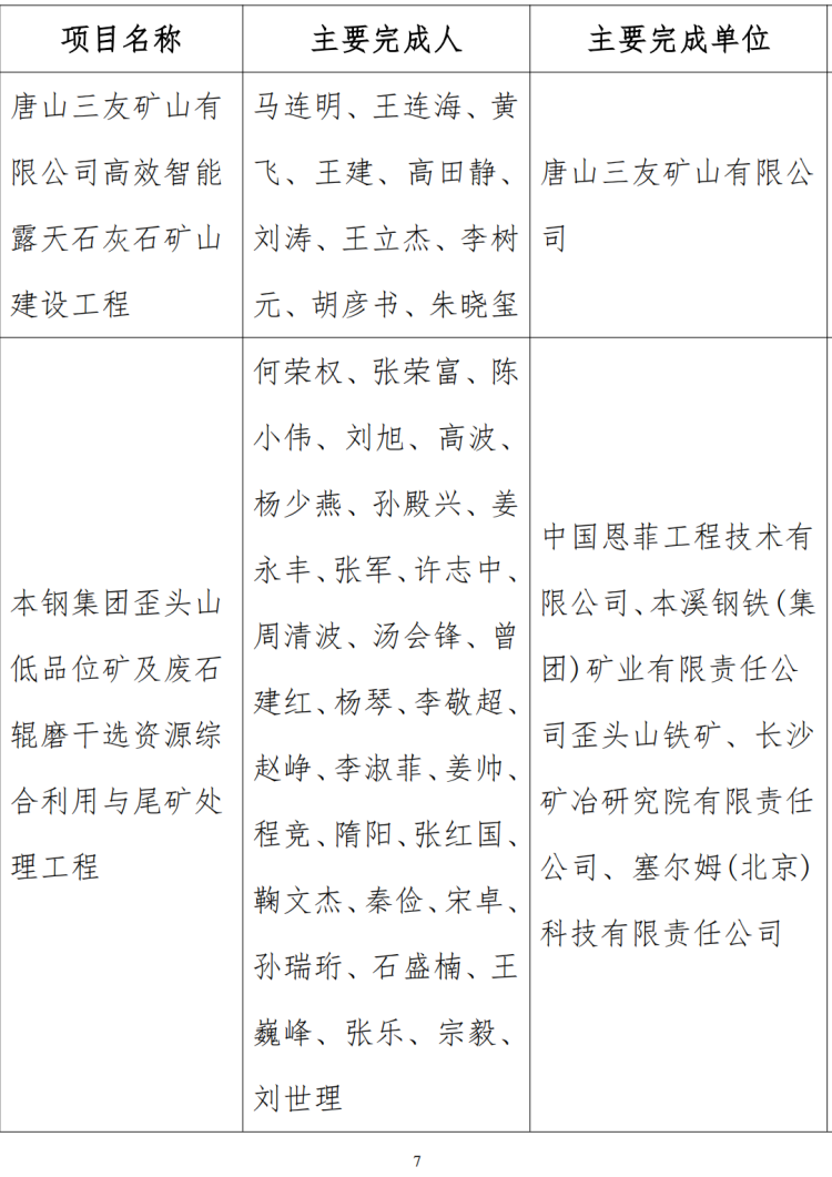 依據(jù)《綠色礦山科學(xué)技術(shù)獎(jiǎng)管理辦法》規(guī)定和《關(guān)于申報(bào)2024年度綠色礦山重大工程獎(jiǎng)的通知》綠盟(2024)27號(hào)的要求,綠色礦山科學(xué)技術(shù)獎(jiǎng)勵(lì)辦公室對(duì)申報(bào)綠色礦山科學(xué)技術(shù)獎(jiǎng)(國(guó)家獎(jiǎng)勵(lì)辦備案編號(hào)0265)的重大工程類(lèi)項(xiàng)目通過(guò)形式審查、初評(píng)、復(fù)核、專(zhuān)家現(xiàn)場(chǎng)實(shí)地核查、終審等環(huán)節(jié),確定了15項(xiàng)成果為2024年度綠色礦山重大工程獎(jiǎng)擬獲獎(jiǎng)項(xiàng)目,現(xiàn)予以公示。一等獎(jiǎng)完成人不超過(guò)15人,二等獎(jiǎng)完成人不超過(guò)10人,對(duì)于超過(guò)限額的項(xiàng)目,請(qǐng)與綠色礦山科學(xué)技術(shù)獎(jiǎng)勵(lì)辦公室聯(lián)系。自公示之日起7日內(nèi),任何單位以及個(gè)人對(duì)擬獲獎(jiǎng)名單有異議者,須憑本人真實(shí)身份以書(shū)面形式向綠色礦山科學(xué)技術(shù)獎(jiǎng)勵(lì)辦公室提出,同時(shí)需要提供準(zhǔn)確的相關(guān)材料,凡是匿名異議以及超過(guò)公示期內(nèi)提出異議者恕不予受理。特此公示。聯(lián)系方式:呂老師 15712878741通訊地址:北京市海淀區(qū)學(xué)清路9號(hào)匯智大廈B座311室附件:2024年度綠色礦山重大工程獎(jiǎng)擬獲獎(jiǎng)名單