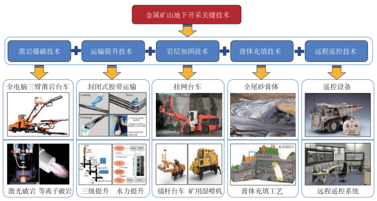 目前,金屬礦山正面臨著“由淺至深、由易至難、由富至貧”的關(guān)鍵轉(zhuǎn)型期,在理論技術(shù)、裝備等方面都面臨著全新挑戰(zhàn)。面對以上挑戰(zhàn),金屬礦山地下開采關(guān)鍵技術(shù)的研究顯得尤為關(guān)鍵?,F(xiàn)在,金屬礦山地下開采關(guān)鍵技術(shù)主要體現(xiàn)在以下五個方面:鑿巖爆破技術(shù)、運輸提升技術(shù)、巖層加固技術(shù)、膏體充填技術(shù)、遠(yuǎn)程遙控技術(shù)。圍繞這五大關(guān)鍵技術(shù),本研究系統(tǒng)綜述其發(fā)展歷程及新進(jìn)展,金屬礦山地下開采關(guān)鍵技術(shù)架構(gòu)如圖2所示。