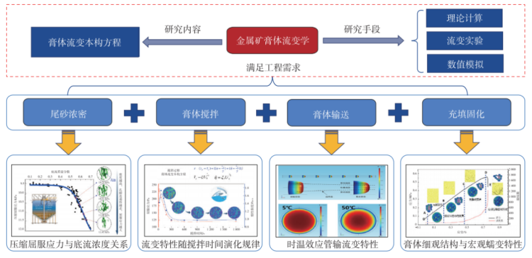 金屬礦膏體充填的各個工藝環(huán)節(jié)的共性基礎(chǔ)理論為金屬礦膏體流變學(xué),以膏體流變本構(gòu)方程為研究內(nèi)容,以理論計算、流變實驗和數(shù)值模擬為主要研究手段,滿足膏體充填中尾砂濃密、膏體攪拌、膏體輸送以及充填固化這4個工藝環(huán)節(jié)的工程需求。其中,濃密技術(shù)旨在獲得穩(wěn)定合適的底流濃度,為制備合格膏體奠定基礎(chǔ);攪拌技術(shù)使物料混合均勻,為膏體管道輸送流態(tài)化和力學(xué)特性均質(zhì)化提供條件;輸送技術(shù)追求低能耗、少磨損;填充技術(shù)實現(xiàn)充填體強度均勻分布與充分接頂率,上述4種工藝對應(yīng)著膏體充填的四大關(guān)鍵技術(shù)。膏體充填技術(shù)具有“安全、經(jīng)濟、環(huán)保、高效”的豐富內(nèi)涵,是金屬礦山綠色開采體系的一個重要技術(shù)支撐,被我國有關(guān)部委列為示范技術(shù),是全球礦業(yè)領(lǐng)域的研究熱點。膏體充填核心理論體系架構(gòu)如圖3所示。
