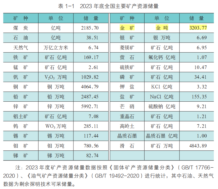 在自然資源概況方面,《公報(bào)》顯示,截至2023年底,全國已發(fā)現(xiàn)173種礦產(chǎn),其中,能源礦產(chǎn)13種,金屬礦產(chǎn)59種,非金屬礦產(chǎn)95種,水氣礦產(chǎn)6種。全國主要礦產(chǎn)儲量中,金礦3203.77噸。