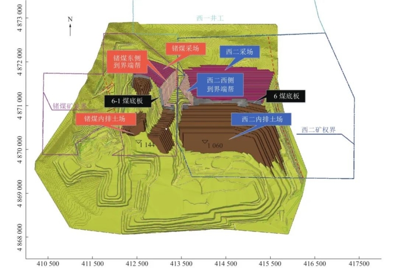 在我國大型露天煤田開發(fā)中,常常有多家煤炭企業(yè)進(jìn)入同一煤田,各煤炭企業(yè)均是一個(gè)開發(fā)主體,對國家劃撥條區(qū)煤炭資源進(jìn)行開采,同時(shí)或先后建設(shè)幾個(gè)露天礦。相鄰露天礦在開采作業(yè)過程中所形成相鄰端幫因受兩礦采動(dòng)影響較大,易發(fā)生滑坡災(zāi)害,尤其是相鄰端幫到界邊坡。勝利西二號露天煤礦和烏蘭圖嘎鍺煤露天礦為同一煤田相鄰露天礦,兩礦采礦權(quán)在相鄰端幫處不重合,致使西二露天礦西幫和鍺煤露天礦東幫之間形成一個(gè)梯形臺(tái)體,受下覆斷層破碎帶及兩礦作業(yè)影響,臺(tái)體內(nèi)出現(xiàn)底臌、裂縫、斷層垮塌等地質(zhì)災(zāi)害跡象。隨著兩礦剝采工程發(fā)展及對相鄰端幫進(jìn)行靠幫作業(yè),相鄰端幫到界邊坡間將產(chǎn)生一個(gè)更為高陡的不規(guī)則臺(tái)體,為避免災(zāi)害性滑坡發(fā)生,對該高陡臺(tái)體穩(wěn)定性分析基礎(chǔ)上,提出“整體挖除回填”的治理方式并確定具體的治理方案。該治理方案明確“整體挖除回填”治理方式作業(yè)范圍,設(shè)計(jì)了治理完成時(shí)清理工作幫及內(nèi)排土場邊坡形態(tài),可徹底消除地質(zhì)災(zāi)害隱患,并釋放西二露天礦內(nèi)排空間931.83萬m3,鍺煤露天礦內(nèi)排空間764.69萬m3,兩礦可繼續(xù)實(shí)現(xiàn)完全內(nèi)排。本研究成果為西二、鍺煤露天礦相鄰端幫斷層帶地質(zhì)災(zāi)害隱患體治理提供必要的理論依據(jù)和技術(shù)支撐,同時(shí)為類似同一煤田相鄰露天礦實(shí)施地質(zhì)災(zāi)害治理提供了相關(guān)經(jīng)驗(yàn)。