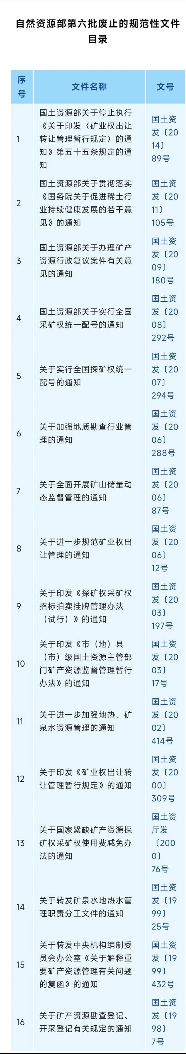 日前,《自然資源部第六批廢止的規(guī)范性文件目錄》公布,廢止16件涉及礦產(chǎn)資源管理的相關規(guī)范性文件(詳見下表)。