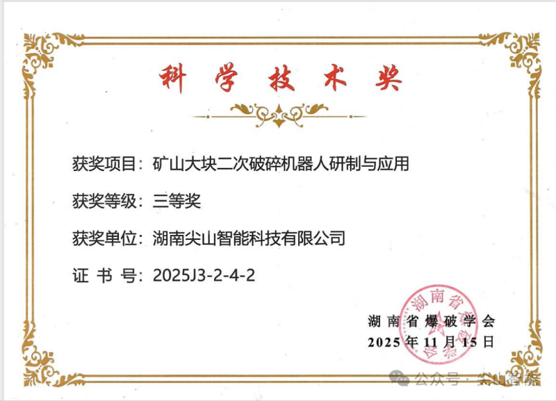 湖南省爆破學會科學技術獎作為省內(nèi)爆破行業(yè)科技創(chuàng)新的標桿性獎項,評選標準嚴苛,涵蓋技術創(chuàng)新性、成果實用性、行業(yè)影響力等多重維度,旨在表彰推動爆破行業(yè)科技進步、破解產(chǎn)業(yè)發(fā)展難題的優(yōu)秀單位與成果。此次獲獎,意味著尖山智能的技術成果已達到行業(yè)領先水平,為爆破行業(yè)的智能化轉(zhuǎn)型提供了極具價值的實踐范本 。