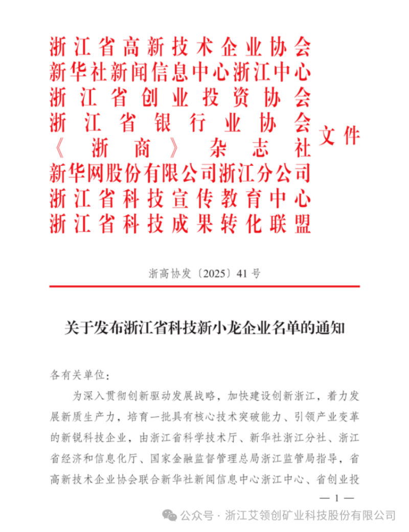 核心提示:近日,浙江省高新技術(shù)企業(yè)協(xié)會等單位聯(lián)合發(fā)布“浙江省科技新小龍”企業(yè)名單。浙江艾領(lǐng)創(chuàng)礦業(yè)科技股份有限公司憑借其在高端礦山機