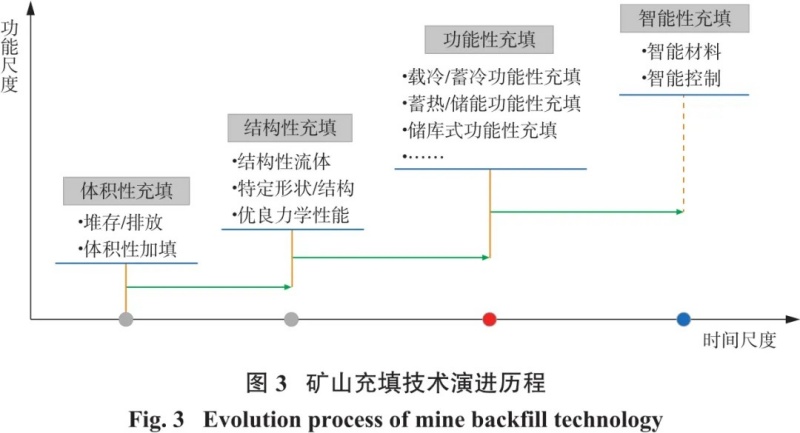 2 新型礦山充填技術(shù)分類及演進歷程根據(jù)礦山充填材料性能,本研究將充填采礦技術(shù)的發(fā)展歷程劃分為4個階段:體積性充填→結(jié)構(gòu)性充填→功能性充填→智能性充填,如圖3所示。