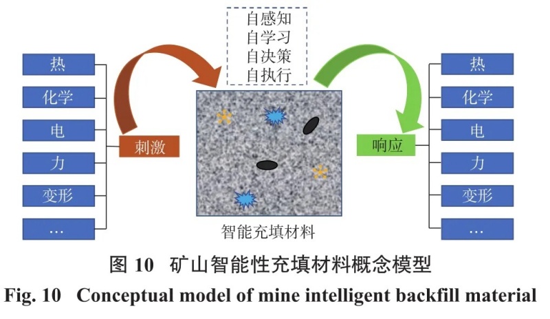 礦山智能充填材料概念模型如圖10所示。智能材料在土木工程中已有研究,如光纖維混凝土、玻璃空心纖維混凝土、記憶合金混凝土等智能材料通過自適應(yīng)和自診斷功能,可提高混凝土結(jié)構(gòu)的穩(wěn)定性。