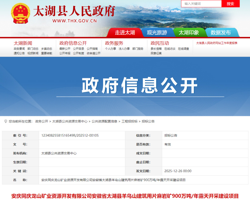 近日,安徽省太湖縣人民政府網(wǎng)站發(fā)布安慶同慶龍山礦業(yè)資源開發(fā)有限公司太湖縣羊烏山建筑用片麻巖礦900萬噸/年露天開采建設(shè)項目招標(biāo)公告。