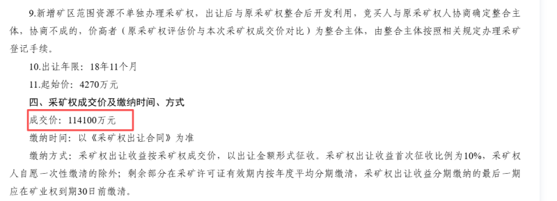 新增礦區(qū)范圍資源不單獨辦理采礦權,出讓后與原采礦權整合后開發(fā)利用,競買人與原采礦權人協(xié)商確定整合主體,協(xié)商不成的,價高者(原采礦權評估價與本次采礦權成交價對比)為整合主體,由整合主體按照相關規(guī)定辦理采礦登記手續(xù)。繳費方式靈活,采礦權出讓收益首繳10%,可自愿一次性繳清全款,剩余部分按規(guī)分期繳納。目前成交結果正處于公示期,公示時間從2025年12月31日至2026年1月14日。