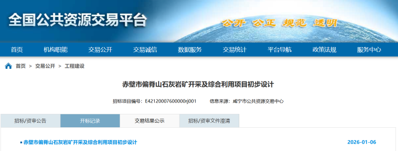 近日,全國公共資源交易平臺發(fā)布赤壁市偏脊山石灰?guī)r礦開采及綜合利用項目初步設(shè)計(標(biāo)段名稱)施工開標(biāo)記錄,共5家單位入選。