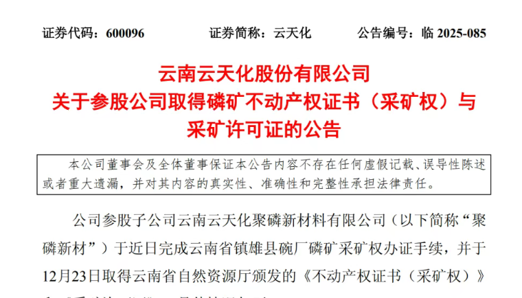 12月25日,云南云天化股份有限公司(下稱“云天化”)公告稱,其參股子公司聚磷新材已正式獲得云南省鎮(zhèn)雄縣碗廠磷礦的采礦許可證。