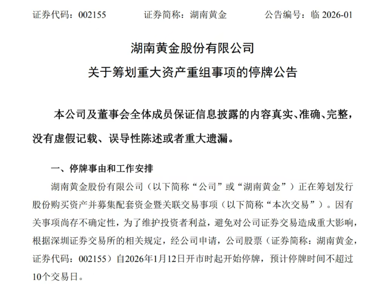 湖南黃金公告稱(chēng),因有關(guān)事項(xiàng)尚存不確定性,為了維護(hù)投資者利益,避免對(duì)公司證券交易造成重大影響,公司股票自2026年1月12日開(kāi)市時(shí)起開(kāi)始停牌,預(yù)計(jì)停牌時(shí)間不超過(guò)10個(gè)交易日。
