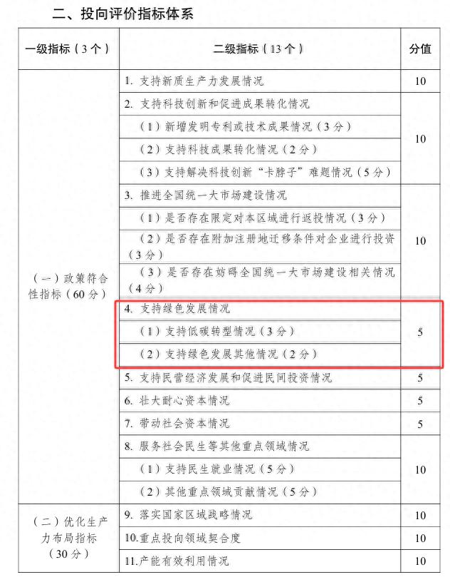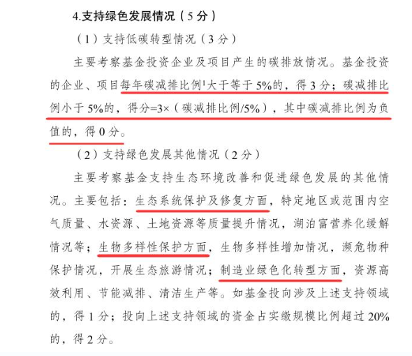 在投向評價指標(biāo)體系中,“支持綠色發(fā)展情況”總分值為5分。