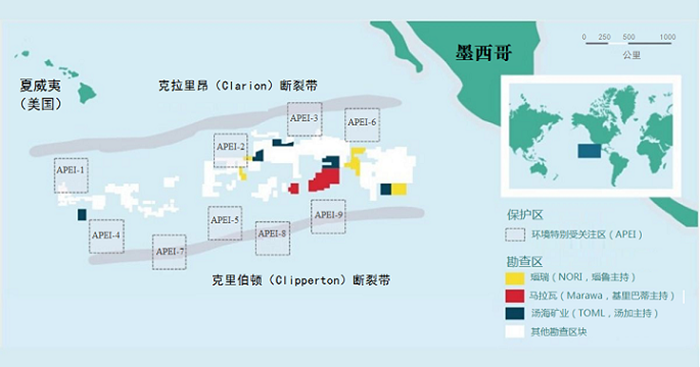 搶占榜首的是Nori公司的克拉利昂-克利伯頓項(xiàng)目,鎳金屬資源量1153萬噸,位于太平洋東北部水深4000-4500米以下。該項(xiàng)目以夏威夷與墨西哥之間的海域命名,是國際水域的一部分。勘探合同由Nori公司持有,但梅塔斯公司(The Metals Company),即前深綠金屬公司(DeepGreen Metals)擁有該區(qū)域的專屬權(quán)。