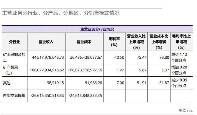 洛陽鉬業(yè)去年收入達(dá)1862.7億元,九成來自礦產(chǎn)貿(mào)易。不過,比起貿(mào)易端,礦產(chǎn)挖掘加工端毛利率更高,達(dá)40.5%。