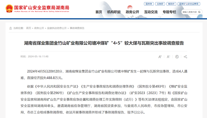 核心提示:2024年4月5日20時20分,湖南省煤業(yè)集團金竹山礦業(yè)有限公司塘沖煤礦發(fā)生一起煤與瓦斯突出事故,造成4人遇難,直接經(jīng)濟損失488.8萬