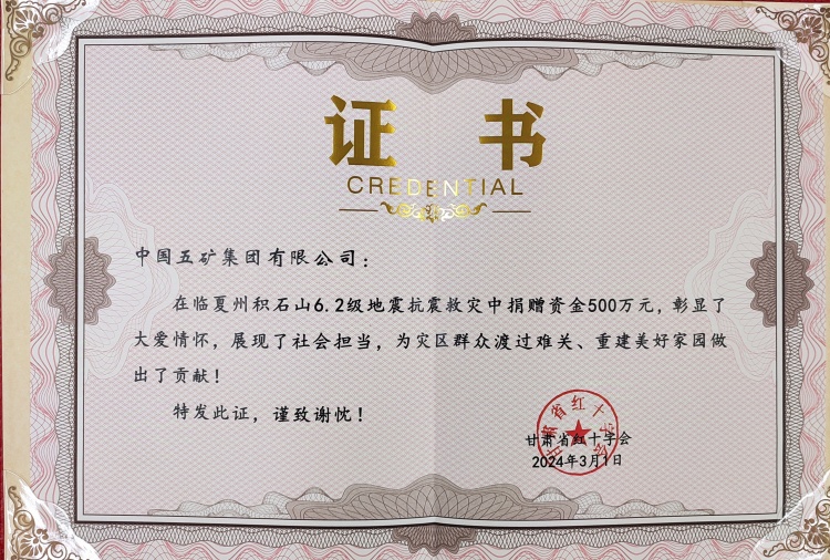 近日,中國紅十字會向中國五礦集團有限公司頒發(fā)“中國紅十字人道勛章”,甘肅省紅十字會向中國五礦頒發(fā)捐贈榮譽證書,以表彰中國五礦在馳援甘肅積石山地震抗震救災(zāi)過程中積極履行社會責(zé)任,幫助災(zāi)區(qū)群眾渡過難關(guān)、重建家園所做的突出貢獻。