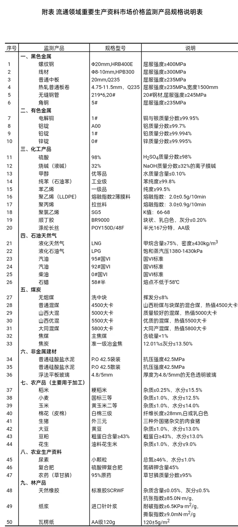 流通領(lǐng)域重要生產(chǎn)資料市場(chǎng)價(jià)格監(jiān)測(cè)內(nèi)容包括9大類(lèi)50種產(chǎn)品的價(jià)格。類(lèi)別與產(chǎn)品規(guī)格說(shuō)明詳見(jiàn)附表。