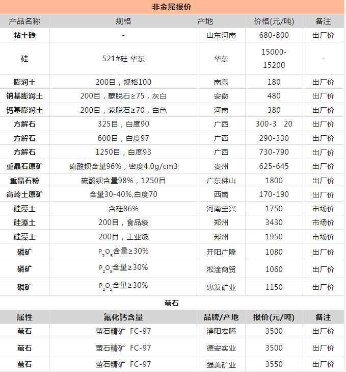 非金屬礦產(chǎn)品報(bào)價(jià)
