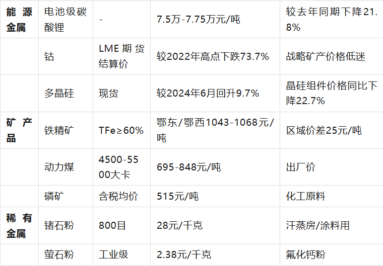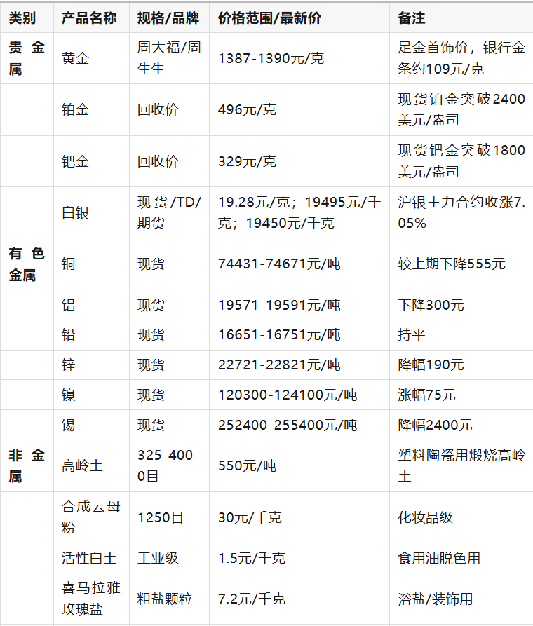 貴金屬價格主要參考2026年1月7日國內(nèi)品牌金店及國際市場數(shù)據(jù);有色金屬、能源金屬指數(shù)來自當日股市收盤數(shù)據(jù)(如有色金屬指數(shù)10049.22,能源金屬指數(shù)2955.61)。非金屬及礦產(chǎn)品價格取自近期市場報價,部分產(chǎn)品因規(guī)格差異存在價格區(qū)間。稀有金屬數(shù)據(jù)結(jié)合了市場行情及特定產(chǎn)品報價(如鍺石粉、螢石粉)。所有價格均為含稅價,增值稅率按行業(yè)常規(guī)執(zhí)行(如13%或3%)。