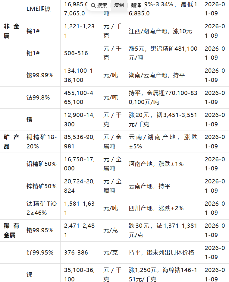 稀有金屬細(xì)化銠、銥、釕、錸等戰(zhàn)略金屬價(jià)格區(qū)間,礦產(chǎn)品增加銅/鉛/鋅精礦及鈦精礦產(chǎn)地價(jià)差分析。