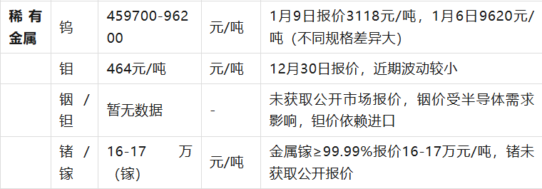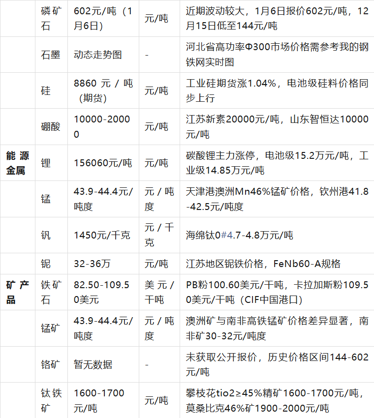 貴金屬價(jià)格受國際地緣政治、美元指數(shù)及通脹預(yù)期影響顯著,黃金、白銀本周累計(jì)漲幅分別達(dá)3.96%、11.72%,但波動率加劇。有色金屬中錫價(jià)受印尼減產(chǎn)消息刺激,兩周暴漲超20%,但交易所三次上調(diào)保證金抑制投機(jī)。非金屬硫磺、磷礦石價(jià)格受季節(jié)性需求及環(huán)保政策影響波動,磷礦石1月6日突漲至602元/噸后回落。稀有金屬鎢價(jià)因供需失衡呈現(xiàn)高波動,鉬價(jià)相對穩(wěn)定。銦、鉭因市場透明度低,缺乏公開報(bào)價(jià)。鐵礦石以美元計(jì)價(jià)為主,PB粉、卡拉加斯粉為代表品種,反映遠(yuǎn)期市場預(yù)期。數(shù)據(jù)時效性截至2026年1月12日18:00,實(shí)際交易請以實(shí)時行情為準(zhǔn)。