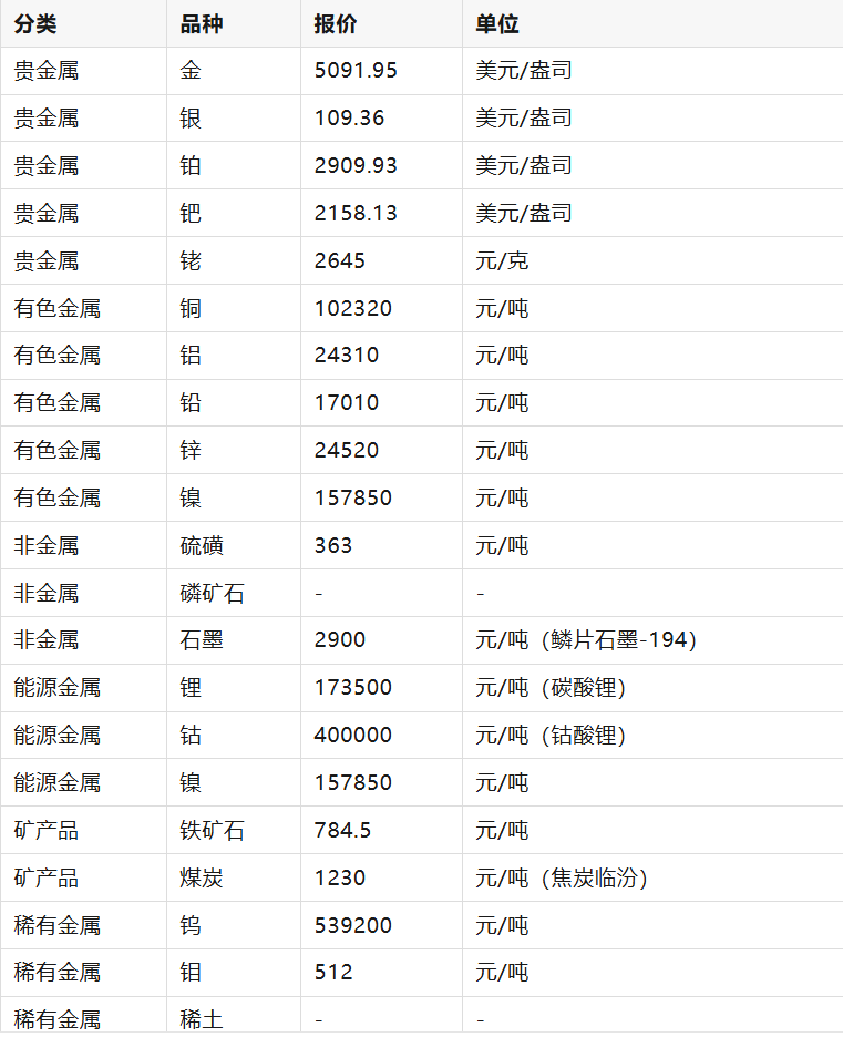 磷礦石和稀土未找到具體報價,表格中以“-”表示。
