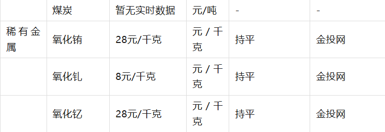 貴金屬數(shù)據(jù)來自國內(nèi)主要品牌實時金價,漲跌幅基于前一日收盤價計算; 有色金屬采用倫敦期貨最新交易價,時間標(biāo)注為18:11(倫敦時間); 非金屬螢石價格取自江西、內(nèi)蒙古產(chǎn)地濕粉報價,石墨因缺乏實時交易數(shù)據(jù)暫未收錄; 能源金屬鈷、鎳價格來自金投網(wǎng)實時行情,鋰因市場波動劇烈暫無有效報價; 礦產(chǎn)品鐵礦石采用青島港、日照港PB粉現(xiàn)貨價,煤炭因區(qū)域差異大未統(tǒng)計具體數(shù)值; 稀有金屬稀土氧化物價格來自金投網(wǎng)實時行情,漲跌幅較小顯示為持平。