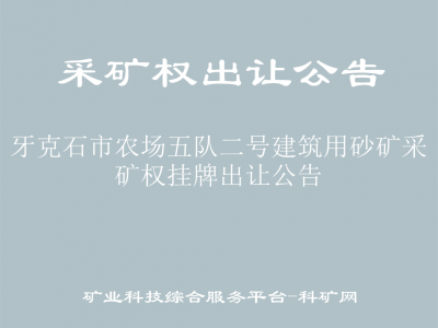 根據(jù)《中華人民共和國礦產(chǎn)資源法》《國土資源部探礦權采礦權招標拍賣掛牌管理辦法(試行)》《礦業(yè)權交易規(guī)則》《內(nèi)蒙古自治區(qū)礦業(yè)權交易實施細則》等有關規(guī)定,經(jīng)牙克石市人民政府批準,牙克石市自然資源局擬對“牙克石市農(nóng)場五隊二號建筑用砂礦”以掛牌方式公開出讓?,F(xiàn)將有關事宜公告如下: