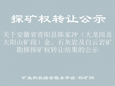 根據(jù)《探礦權(quán)采礦權(quán)轉(zhuǎn)讓管理辦法》《自然資源部關(guān)于印發(fā)礦業(yè)權(quán)出讓交易規(guī)則的通知》等相關(guān)規(guī)定,現(xiàn)將安徽省青陽縣陳家沖(大龍崗及大陽山礦段)金、石灰?guī)r及白云巖礦勘探探礦權(quán)轉(zhuǎn)讓有關(guān)事項(xiàng)公示如下:
