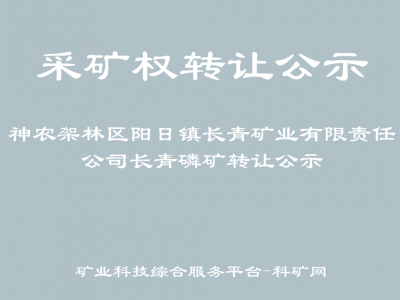 “神農(nóng)架林區(qū)陽日鎮(zhèn)長青礦業(yè)有限責(zé)任公司”申請將其名下的“神農(nóng)架林區(qū)陽日鎮(zhèn)長青礦業(yè)有限責(zé)任公司長青磷礦”采礦權(quán)轉(zhuǎn)讓至“宜昌華文罡科技有限公司”,根據(jù)相關(guān)規(guī)定,予以公示