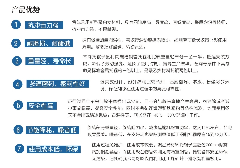 業(yè)現(xiàn)代化“減員提效”相背離。針對(duì)影響托輥使用壽命的四大問題,我們借鑒國內(nèi)外先進(jìn)技術(shù)經(jīng)驗(yàn),成功研發(fā)了新型耐損耐酸堿聚合物托輥,其管體為我公司引進(jìn)德國技術(shù)工藝和設(shè)備,以多種高分子材料混合物通過一系列工藝流程加工而成的托輥專用聚合物管材,擁有自主知識(shí)產(chǎn)權(quán)。新型聚合物托輥除軸和軸承為鋼制外,其余組件全部由熱塑性工程料制成,耐磨損、耐酸堿、抗沖擊力強(qiáng)、重量輕、壽命長、不黏連物料、不結(jié)冰,是替代傳統(tǒng)托輥的優(yōu)秀產(chǎn)品。新型聚合物托輥解決了以下四項(xiàng)核心技術(shù):