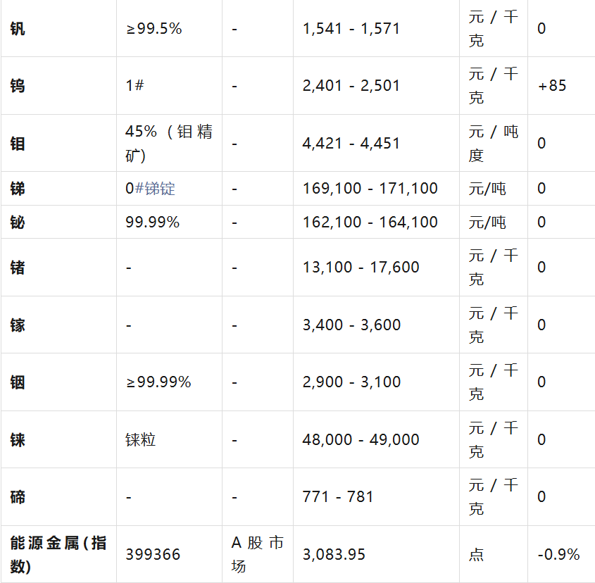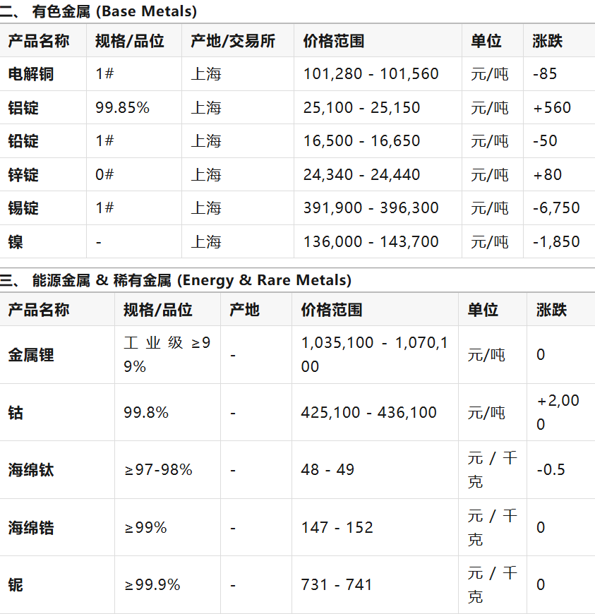 以下價格均為市場參考價,主要來源于上海華通、網(wǎng)易財經(jīng)、金投網(wǎng)等權(quán)威市場信息渠道。 價格單位已統(tǒng)一標注,主要為“元/噸”、“元/千克”或“元/克”。 “漲跌”列中的數(shù)值代表與上一交易日相比的價格變動。 部分稀有金屬和能源金屬的報價以股票指數(shù)形式呈現(xiàn),反映的是市場板塊整體表現(xiàn),而非單一商品價格。