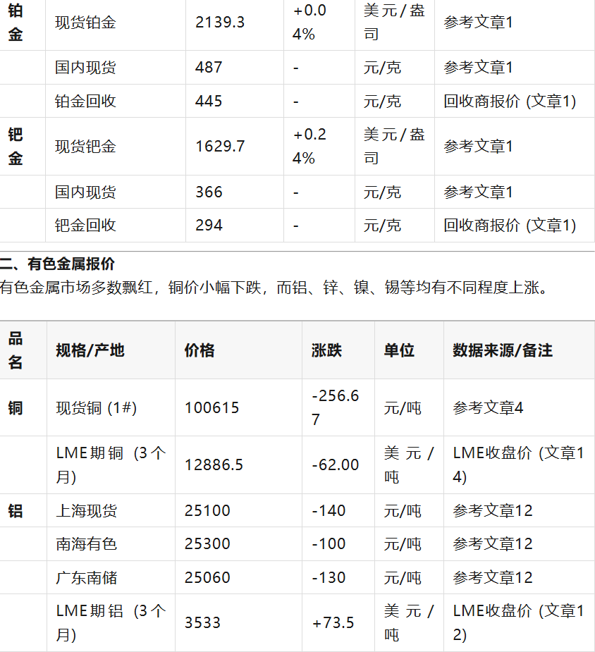 以下價(jià)格信息綜合了多個(gè)信息源,包括現(xiàn)貨市場(chǎng)、期貨交易所和品牌金店,價(jià)格會(huì)因品牌、規(guī)格、產(chǎn)地和交易時(shí)間而異,僅供參考。