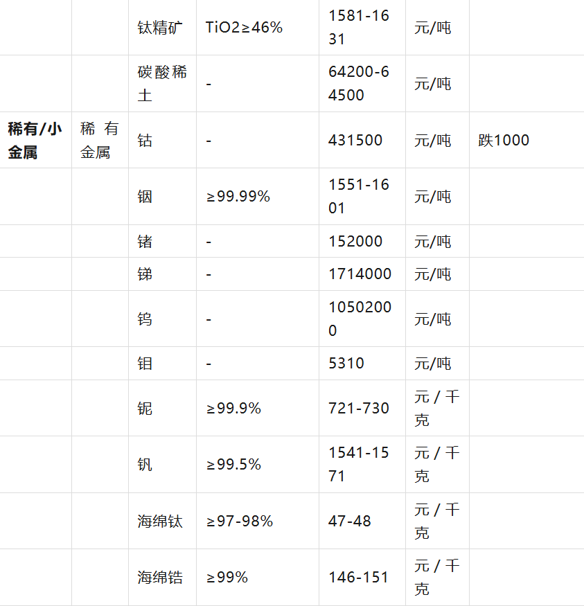 :價(jià)格單位包含元/克、美元/盎司、元/噸、美元/濕噸、元/千克等,請(qǐng)留意表格中的單位。