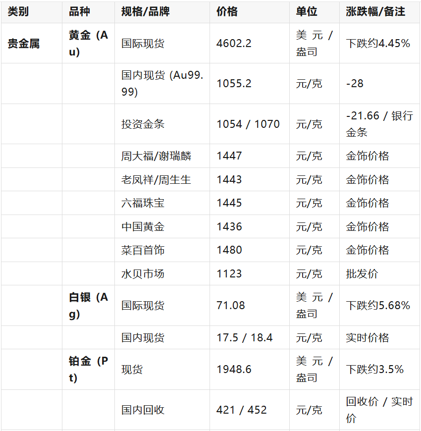 貴金屬大幅下挫:受中東沖突引發(fā)的能源價格上漲和通脹擔憂影響,市場預(yù)期主要央行將維持高利率,導(dǎo)致貴金屬市場遭遇重挫?,F(xiàn)貨黃金一度大跌7%,跌破4600美元/盎司關(guān)口,創(chuàng)下單日超300美元的跌幅,并連續(xù)第七個交易日下跌。白銀、鉑金、鈀金價格也同步大幅下跌,跌幅均在2%-6%不等。國內(nèi)金飾價格隨之下調(diào),較昨日大跌約62元/克。