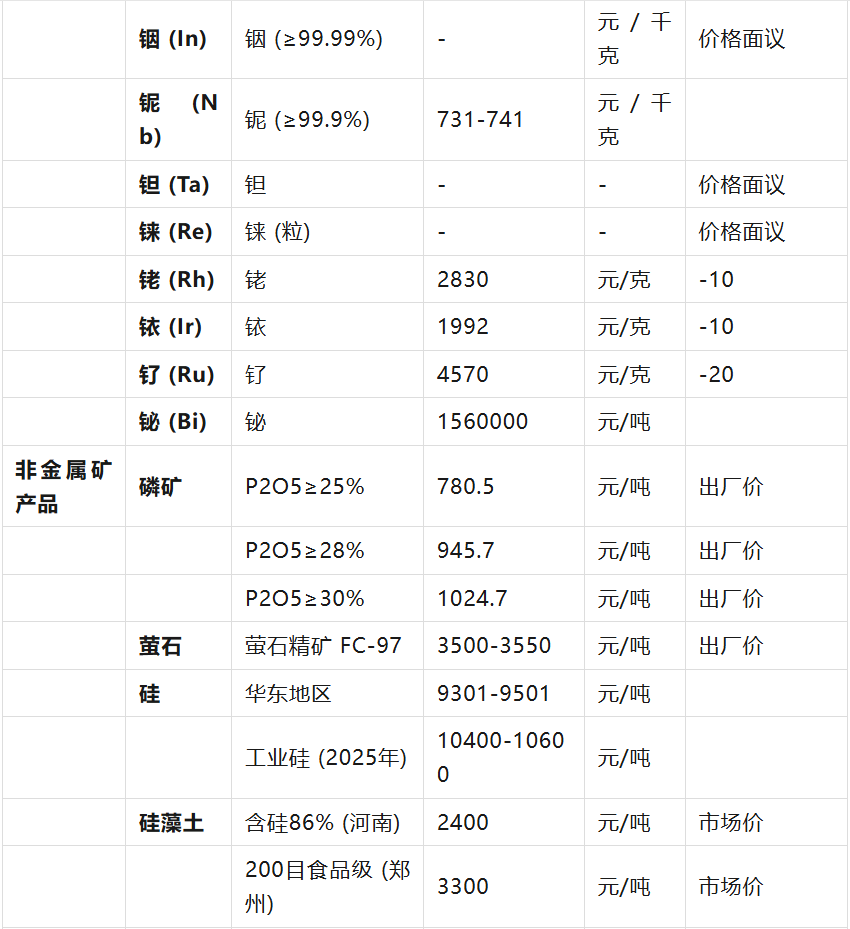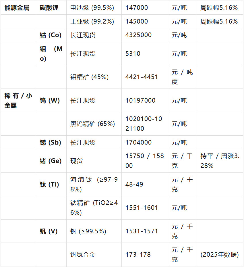 小金屬表現(xiàn)相對堅挺:鍺價近期持續(xù)上漲,近一周累計漲幅超3%。鎢、銻、鈷等稀有金屬價格保持相對穩(wěn)定。