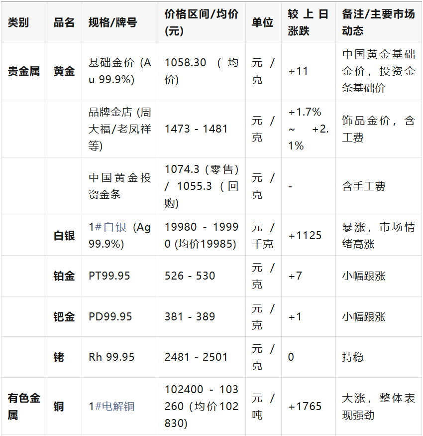 :受市場(chǎng)情緒提振,貴金屬板塊全線上漲,白銀價(jià)格暴漲1125元/千克,黃金價(jià)格上漲11元/克,鉑、鈀等跟漲。