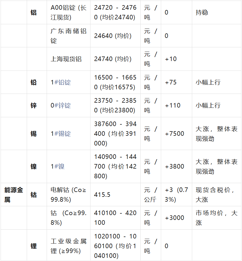 :今日基本金屬板塊整體表現(xiàn)非常強(qiáng)勁,錫、鎳、銅等主要金屬價(jià)格大幅上漲,其中錫大漲7500元/噸,鎳大漲3800元/噸。